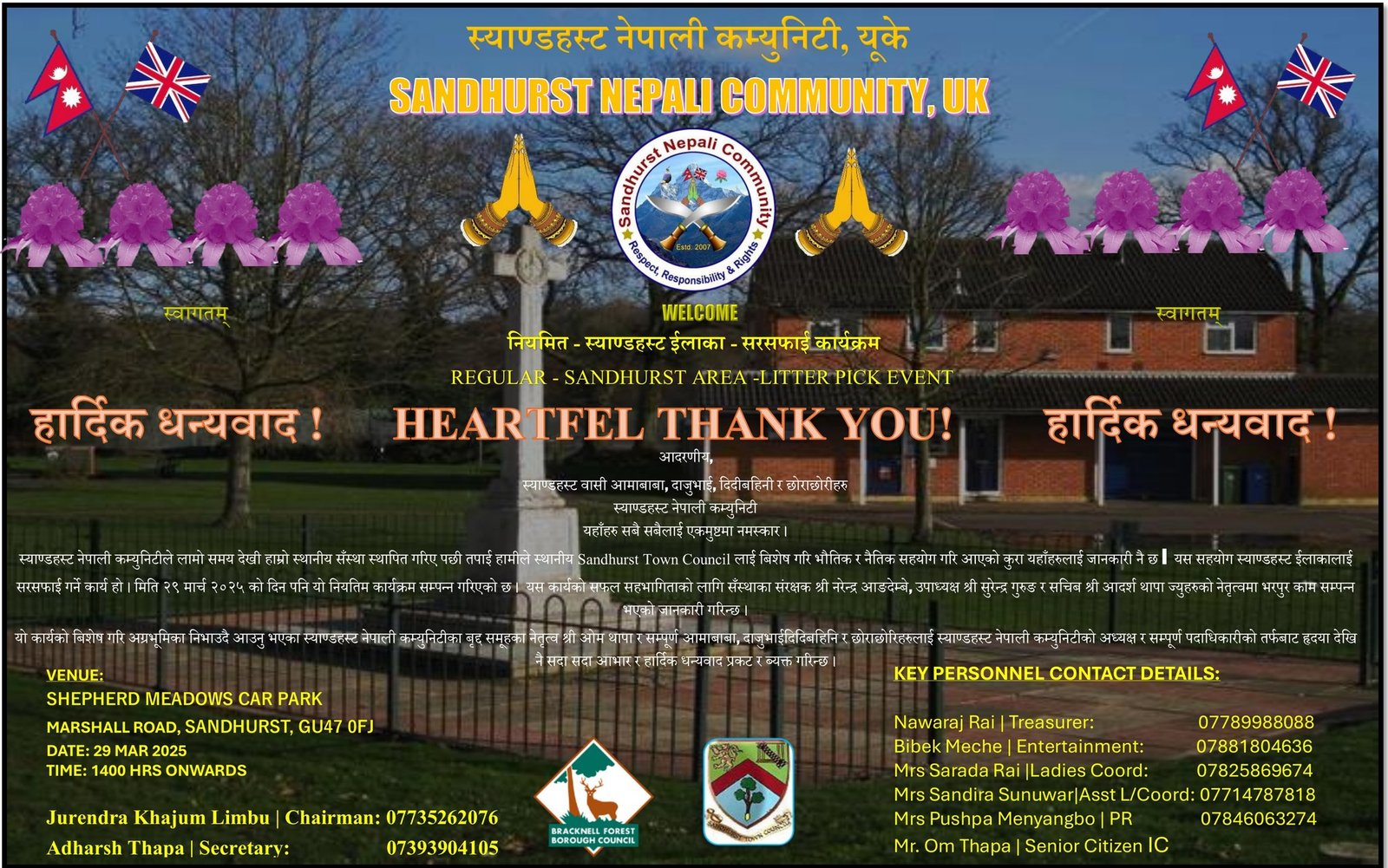 In addition, the Sandhurst Nepali Community has consistently attended and actively participated in community events in line with our long-standing practice. We continue to work closely and collaboratively with the local community, Bracknell Forest Borough Council, and Sandhurst Town Council, strengthening relationships and ensuring positive representation of our community at all levels.