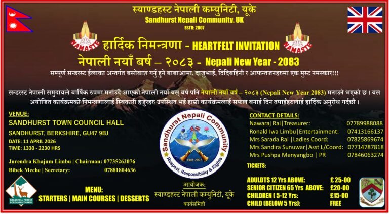 स्यान्डहस्ट नेपाली समुदायद्वारा नेपाली नयाँ वर्ष २०८३ मनाइने । स्यान्डहस्ट, यूके — स्यान्डहस्ट नेपाली समुदायले हरेक वर्षझैँ यस वर्ष पनि नेपाली नयाँ वर्ष भव्य रूपमा मनाउने भएको छ। समुदायले